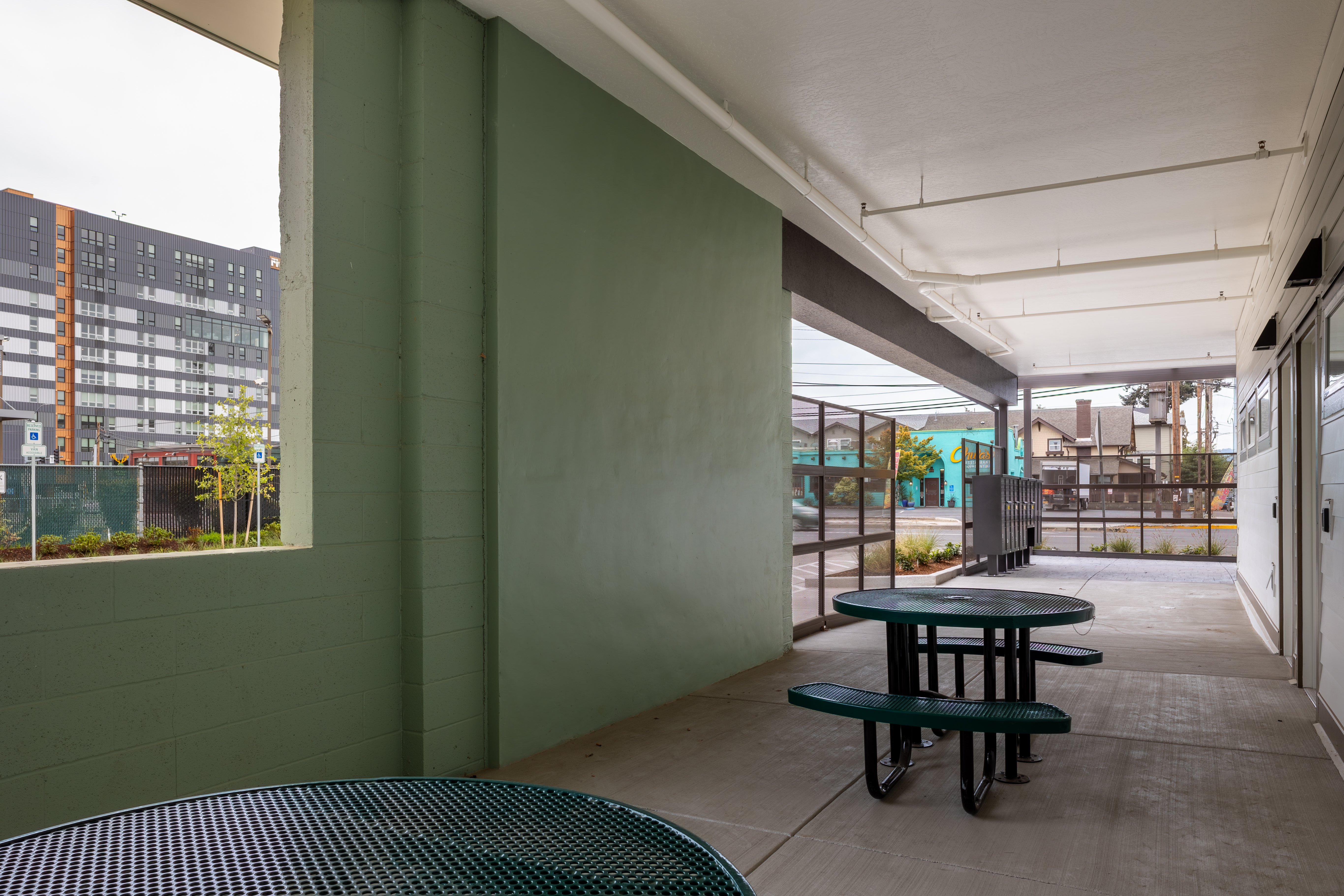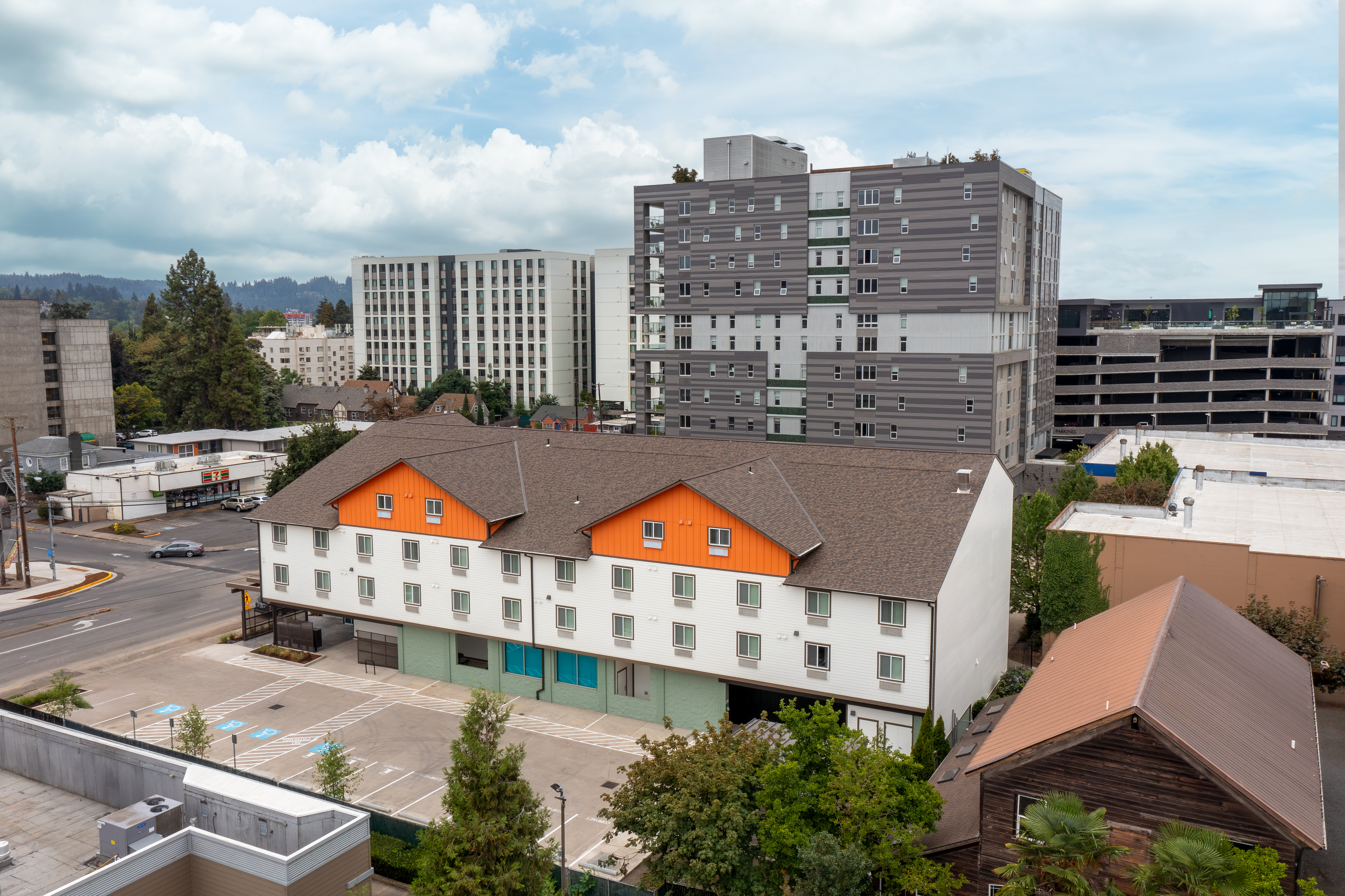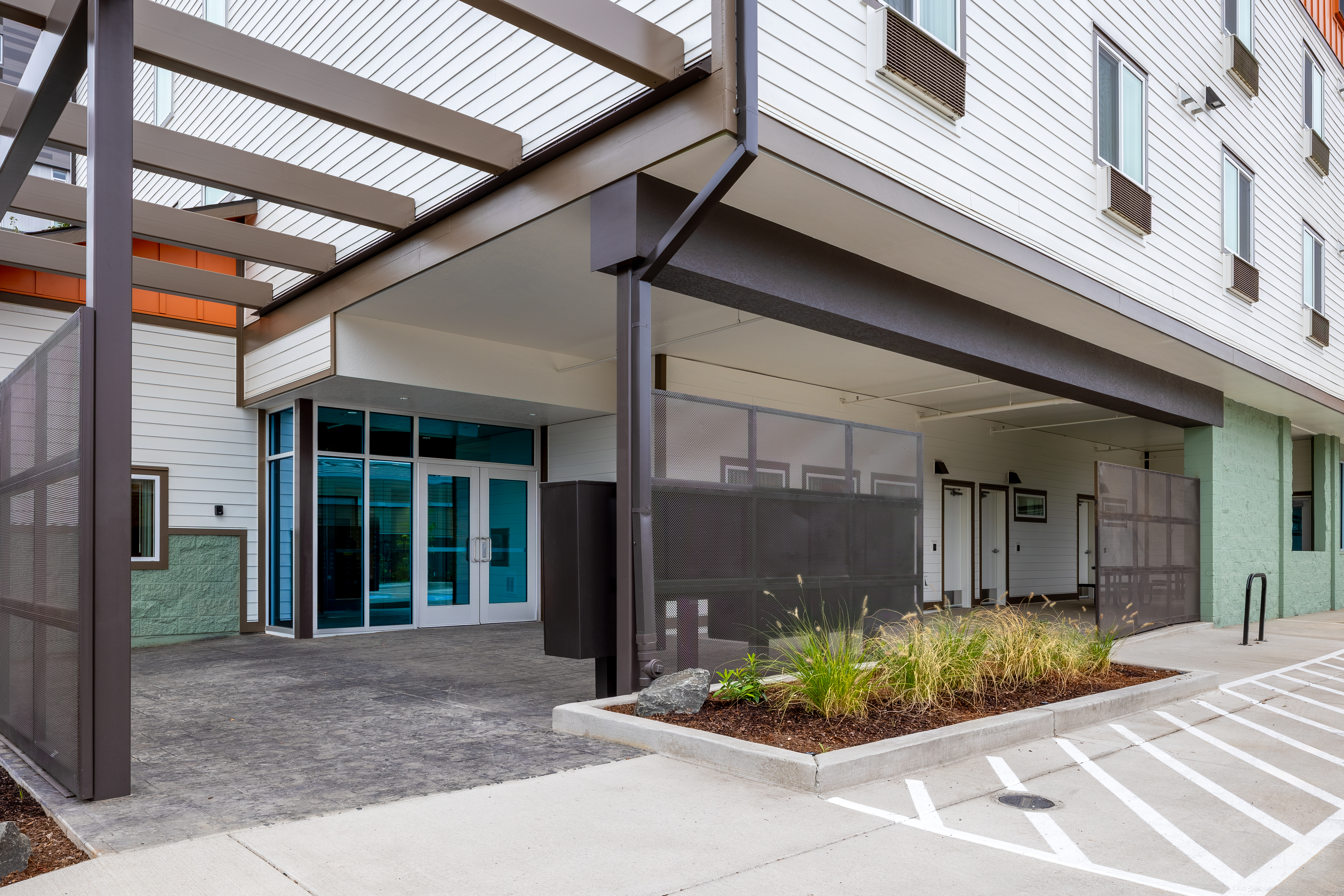 Located at 599 East Broadway in Eugene, OR, Bridges on Broadway was the evolution of Lane County’s Project Turnkey, which provided temporary housing for people who lost their homes to recent wildfires. Homes for Good Housing Agency and Lane County converted the former 50-room Red Lion Hotel into a 57-unit Permanent Supportive Housing (PSH) apartment community serving people experiencing chronic homelessness. Homes for Good provided Project Based Vouchers, and Lane County referred vulnerable people experiencing homelessness from the Coordinated Entry waitlist to Bridges on Broadway. Based on Homes for Good’s experience operating the temporary shelter at this facility, the team continued to operate Bridges on Broadway after its conversion to PSH, providing both property management and supportive services.